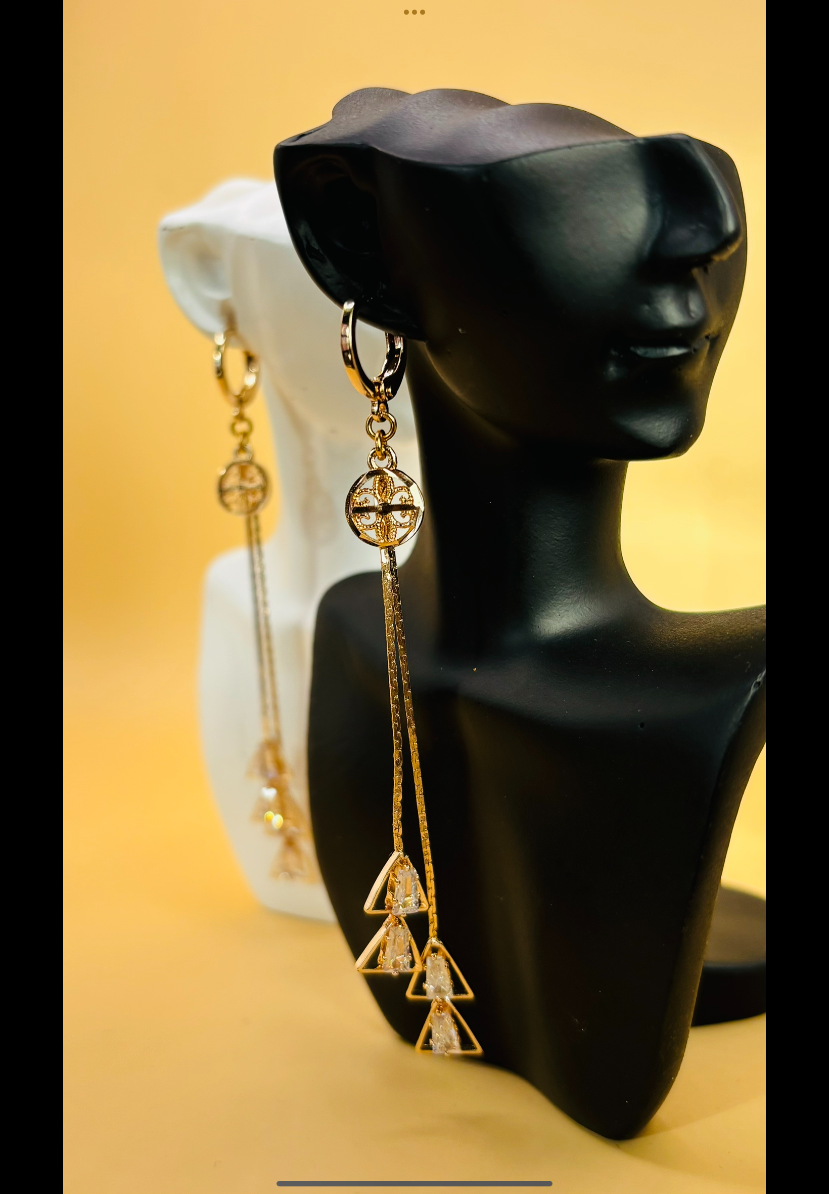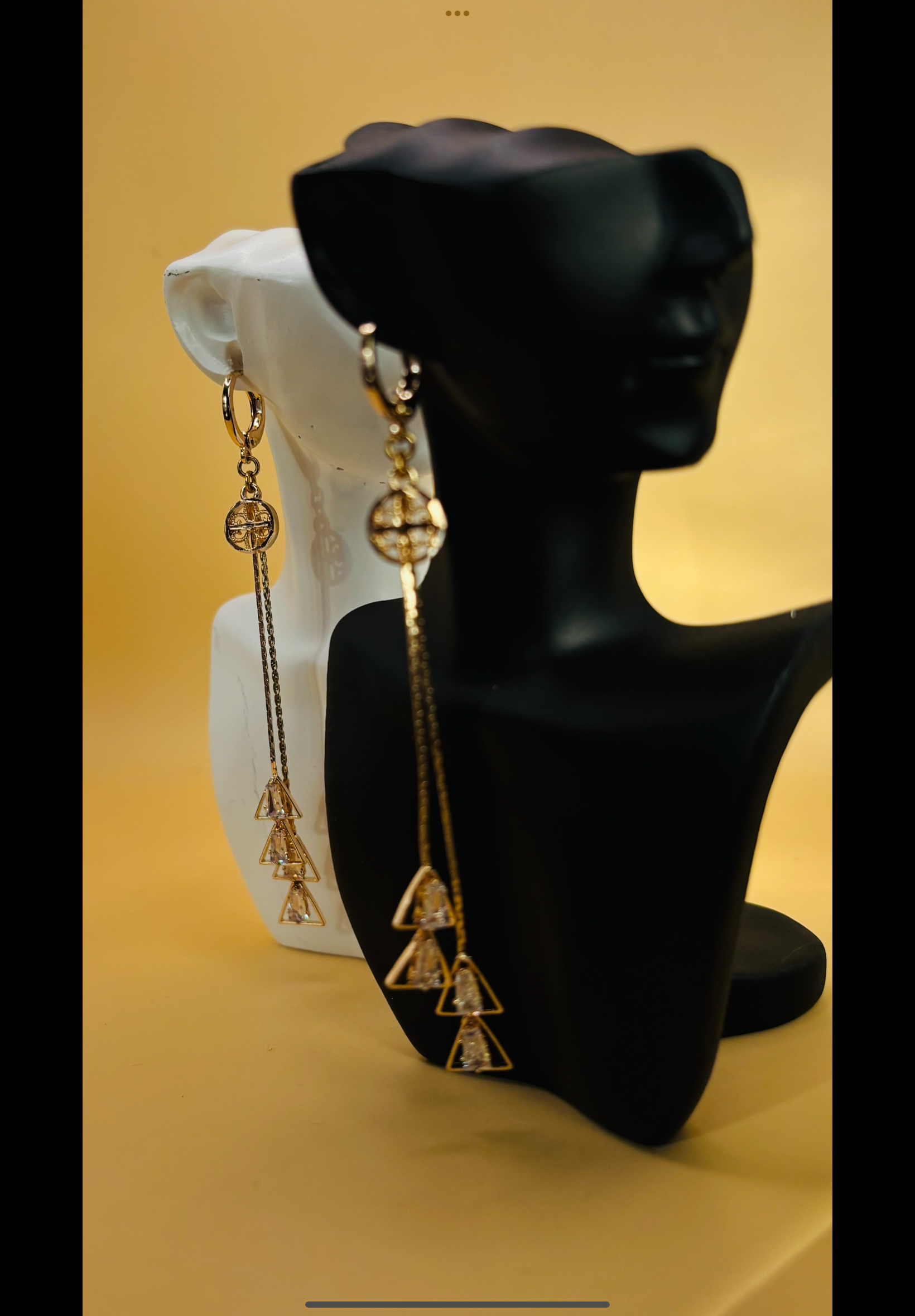 Un design unique associant des formes géométriques et des détails dorés. Ces boucles d’oreilles apportent une touche originale et moderne tout en conservant une élégance naturelle. Idéales pour un style audacieux et raffiné, parfait pour celles qui aiment se démarquer. Finition en or fin, pendants triangulaires sertis de cristaux lumineux. |
