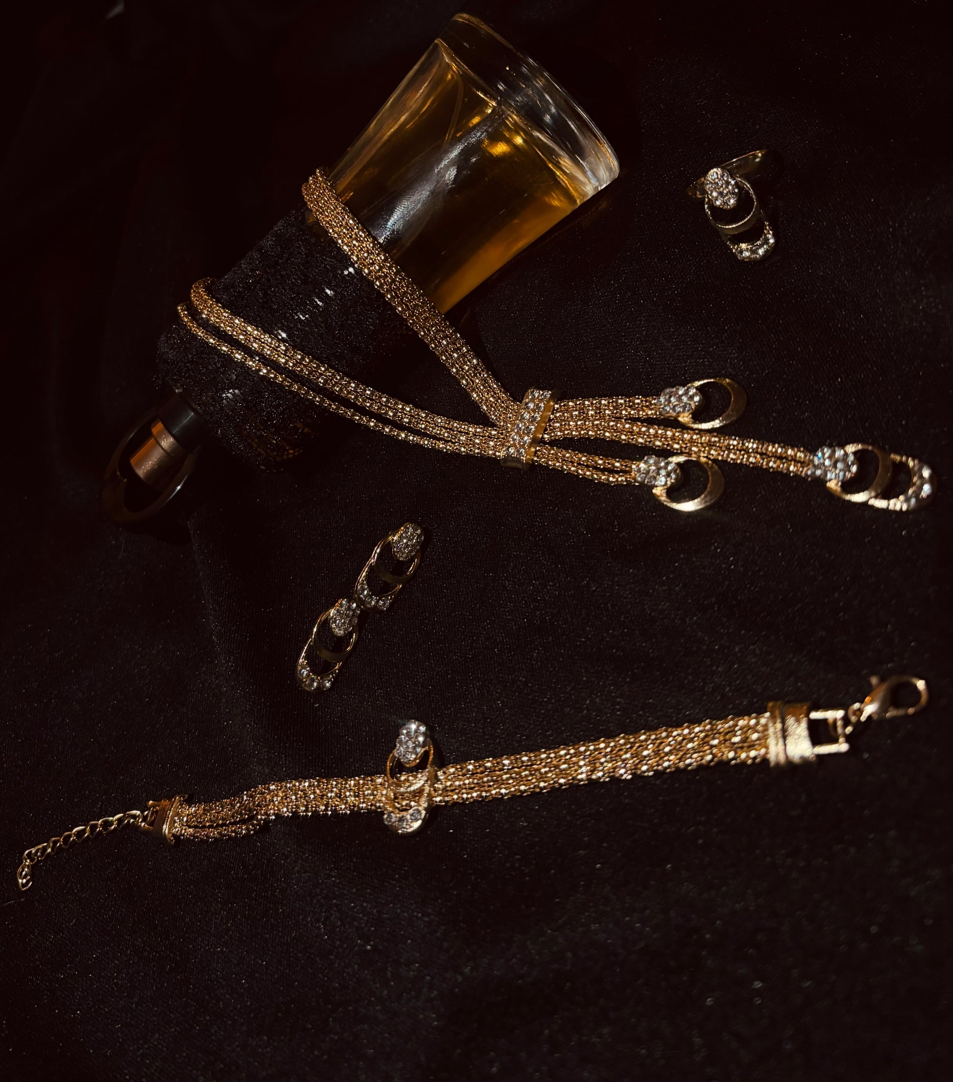 Laissez-vous séduire par l’élégance intemporelle de cette parure dorée, ornée de détails scintillants. Son collier, son bracelet et ses boucles d’oreilles sont conçus pour illuminer votre port de tête avec une touche majestueuse. Un choix idéal pour celles qui aiment allier luxe et finesse.